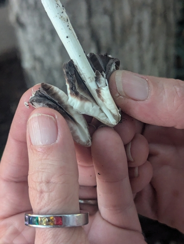 Der Stiel ist weiß-rot-braun. Besondere Merkmale: flocken, brüchig, Ring, hohl, Wurzelbasis, faserig.