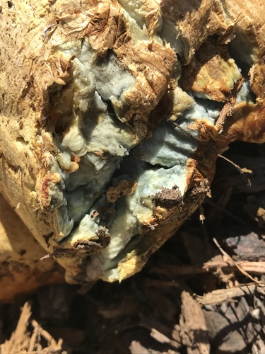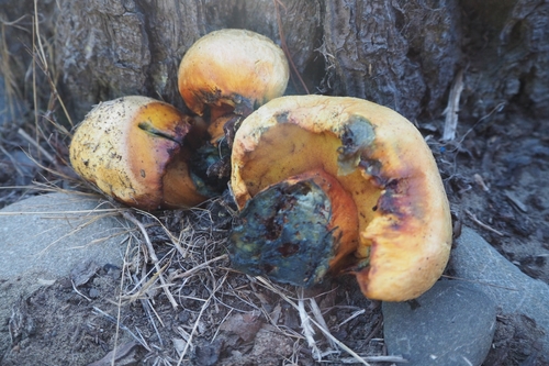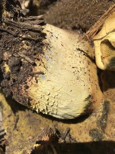 Der Stiel ist orange-braun-gelb-blau. Besondere Merkmale: faserig, flocken, Wurzelbasis, genattert.