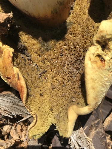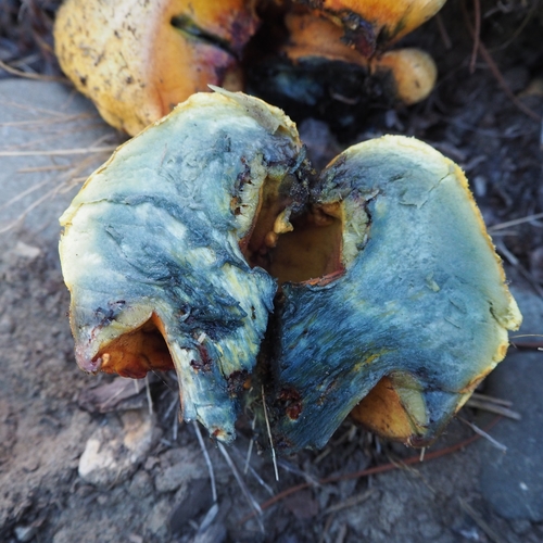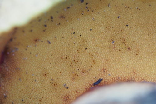 Die Unterseite zeigt Farben von gelb/grün/blau. Sie sind angewachsen, herablaufend.
