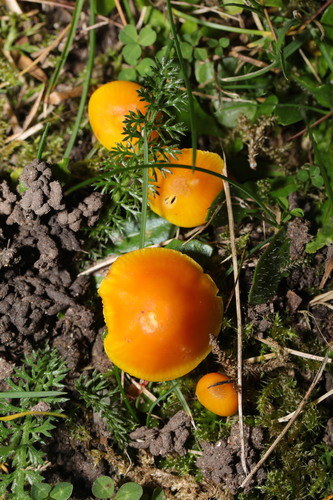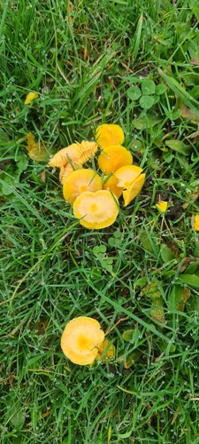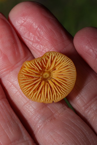 Der 1–4 cm breite Hut ist gelb-orange gefärbt. Die Form ist meist schirmförmig, andere, geriefter Hut.