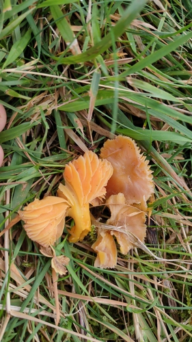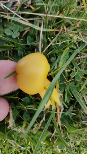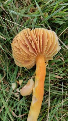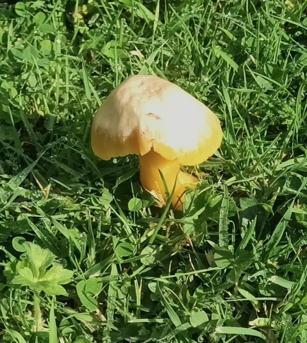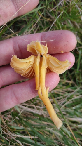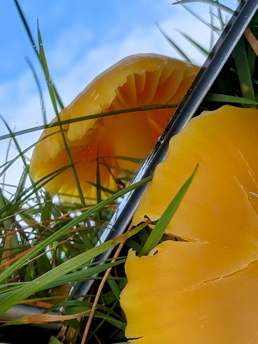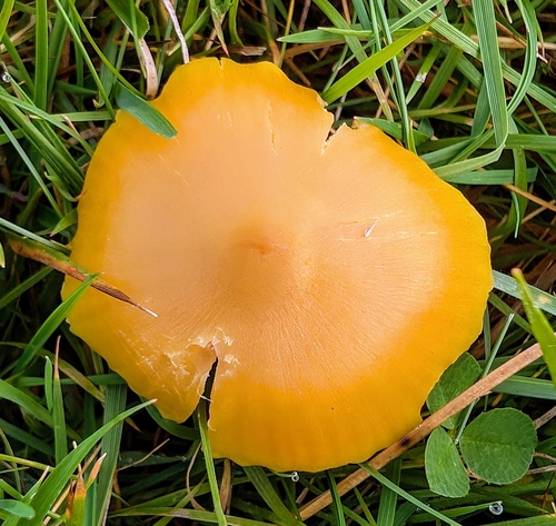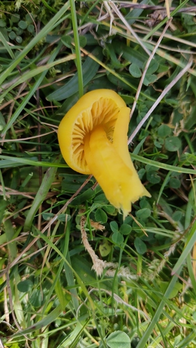 Der 2–7 cm breite Hut ist gelb-orange-rot gefärbt. Die Form ist meist kegelförmig, schirmförmig, geriefter Hut. Er ist hygrophan (Die Hutfarbe ändert sich bei Feuchtigkeit).