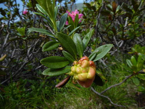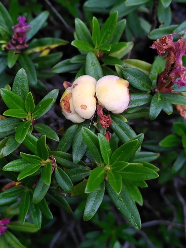 Der Alpenrosen-Nacktbasidie (Exobasidium rhododendri) ist ein Pilz mit dem Speisewert ungenießbar. Die Hauptsaison erstreckt sich von Juni bis Oktober. Er wächst bevorzugt auf Holz.