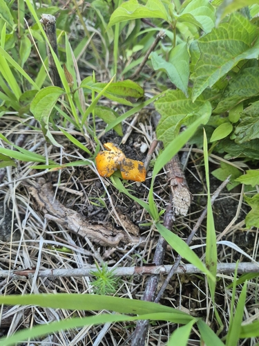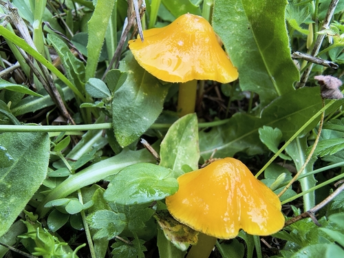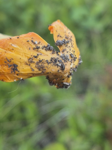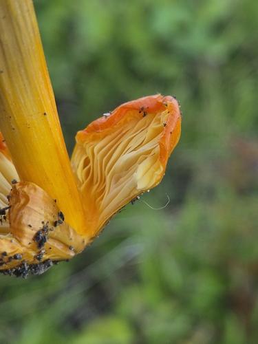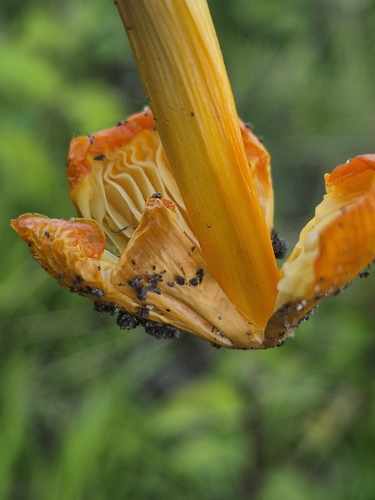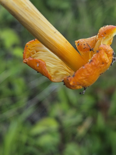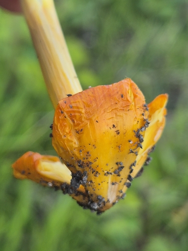 Der 1–5 cm breite Hut ist orange-gelb-rot gefärbt. Die Form ist meist kegelförmig, andere, schirmförmig, geriefter Hut. Er ist hygrophan (Die Hutfarbe ändert sich bei Feuchtigkeit).