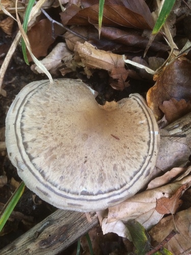 Der 4–13 cm breite Hut ist braun-blau-gelb-grün-grau gefärbt. Die Form ist meist schirmförmig, andere, geriefter Hut.