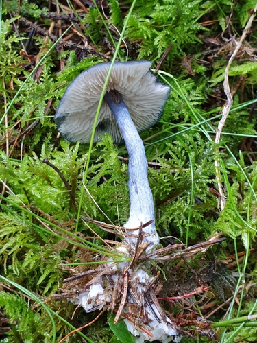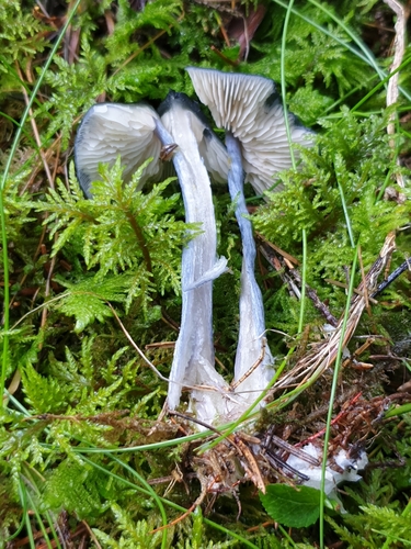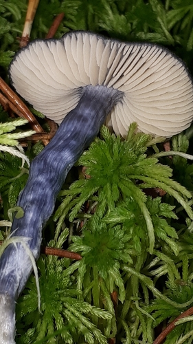 Der Stiel ist blau-grau-weiß. Besondere Merkmale: faserig, brüchig, Wurzelbasis, hohl.