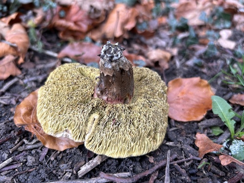 Die Unterseite zeigt Farben von gelb/grün. Sie sind angewachsen, herablaufend.
