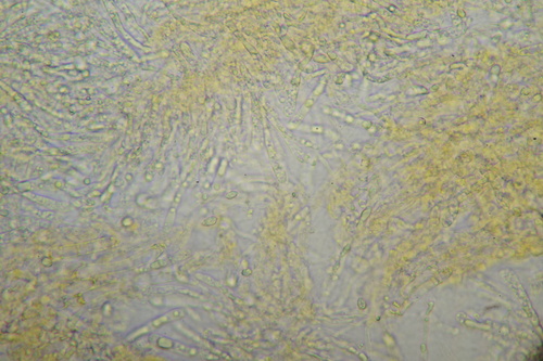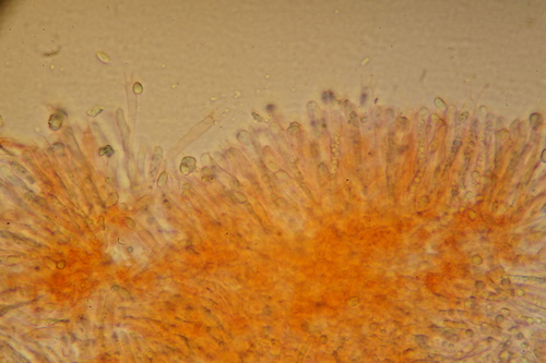 Der Stiel ist gelb-orange. Besondere Merkmale: brüchig, Wurzelbasis, faserig.