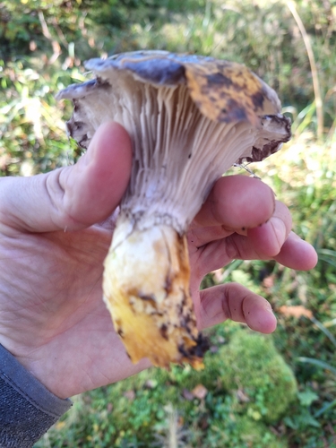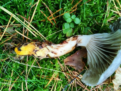 Der Stiel ist grau-weiß-gelb. Besondere Merkmale: faserig, Ring, flocken, Wurzelbasis.