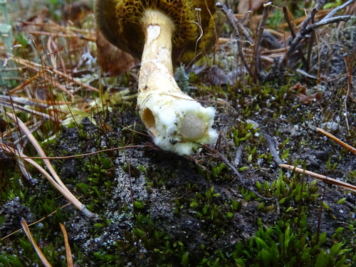 Der Stiel ist orange-gelb-weiß-braun. Besondere Merkmale: faserig, brüchig, Wurzelbasis, genattert.