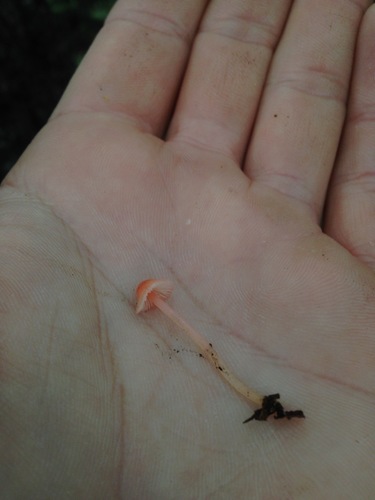 Der 1–4 cm breite Hut ist rot-orange-rosa gefärbt. Die Form ist meist andere, kegelförmig, schirmförmig, geriefter Hut. Er ist hygrophan (Die Hutfarbe ändert sich bei Feuchtigkeit).