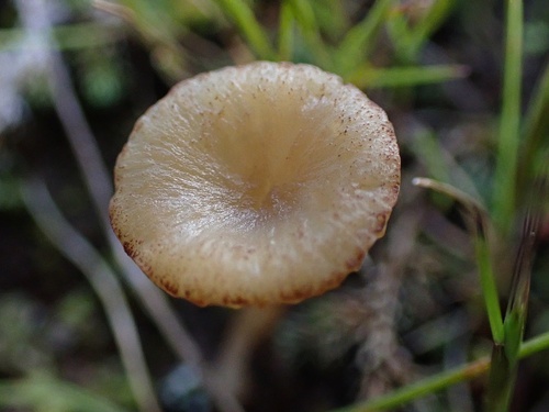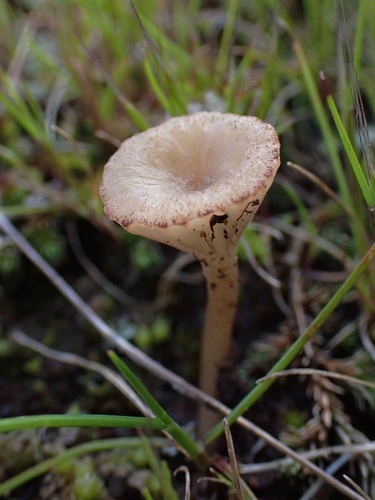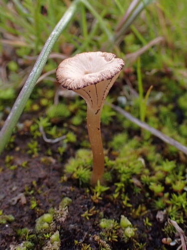 Der 1–5 cm breite Hut ist braun-rosa gefärbt. Die Form ist meist trichterförmig, geriefter Hut. Er ist hygrophan (Die Hutfarbe ändert sich bei Feuchtigkeit).