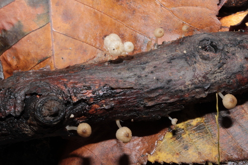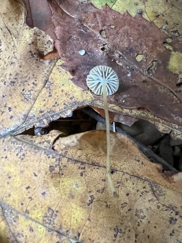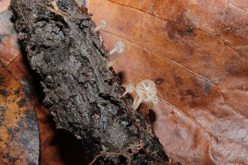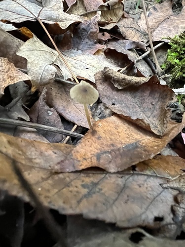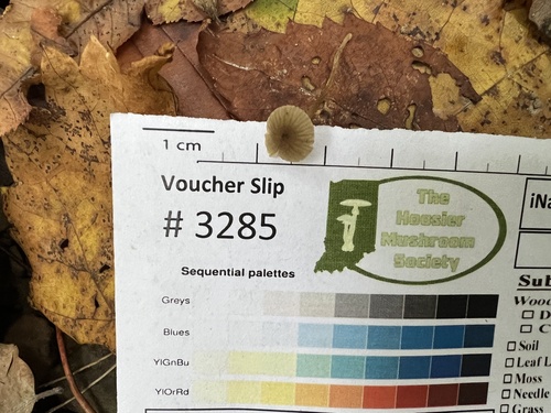 Der 1–3 cm breite Hut ist braun-gelb-grau-weiß gefärbt. Die Form ist meist andere, schirmförmig, geriefter Hut. Er ist hygrophan (Die Hutfarbe ändert sich bei Feuchtigkeit).