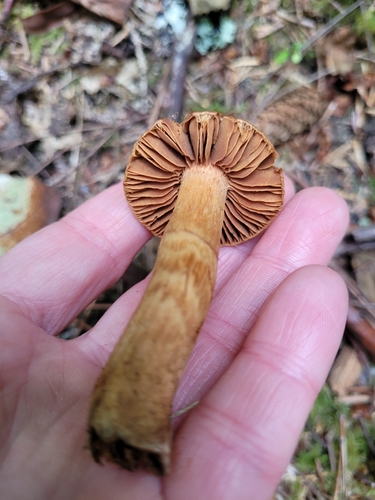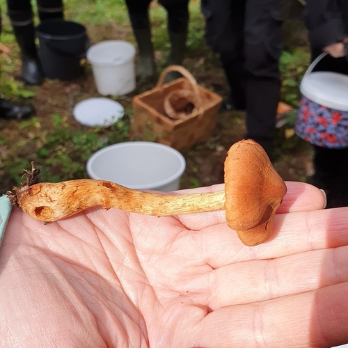 Der Stiel ist braun-orange-rot-gelb. Besondere Merkmale: faserig, brüchig, Wurzelbasis, genattert, knollige Basis.