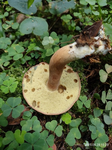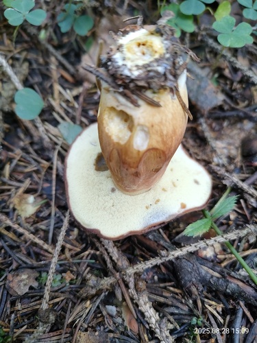 Der Stiel ist gelb-braun-orange-weiß. Besondere Merkmale: faserig, brüchig, Wurzelbasis, genattert.