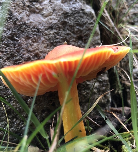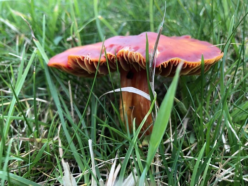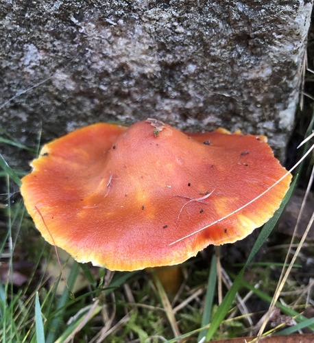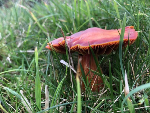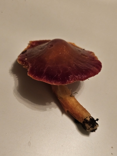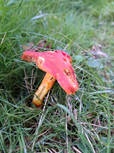 Der 2–8 cm breite Hut ist rot-orange gefärbt. Die Form ist meist kegelförmig, schirmförmig, andere. Er ist hygrophan (Die Hutfarbe ändert sich bei Feuchtigkeit).