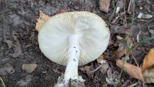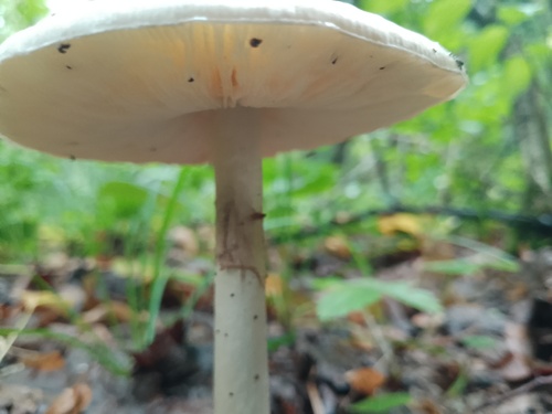 Der Stiel ist weiß-gelb-grau-grün. Besondere Merkmale: Ring, knollige Basis, faserig, Wurzelbasis, genattert.
