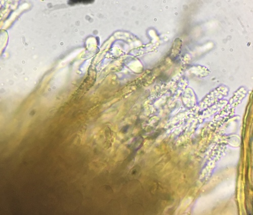 Der 1–1 cm breite Hut ist braun-gelb-grün gefärbt. Die Form ist meist trichterförmig.
