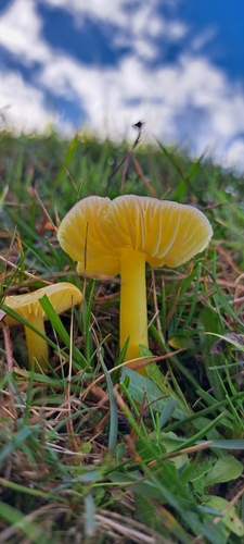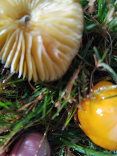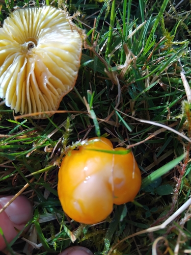 Der 1–6 cm breite Hut ist gelb-orange-rot gefärbt. Die Form ist meist kegelförmig, schirmförmig, andere. Er ist hygrophan (Die Hutfarbe ändert sich bei Feuchtigkeit).