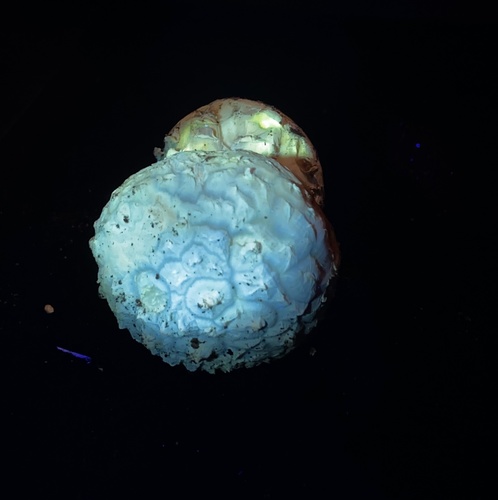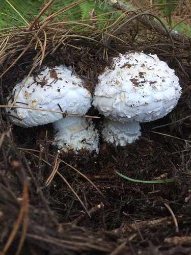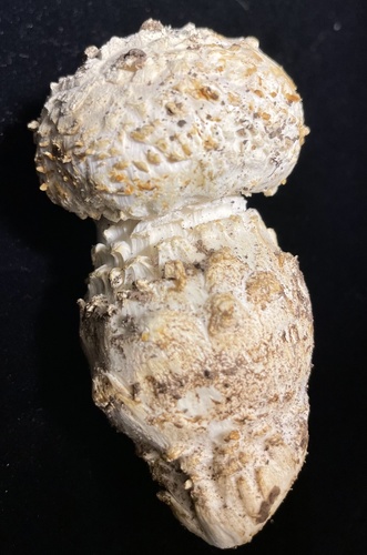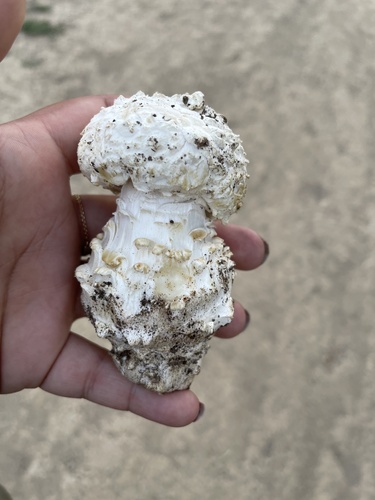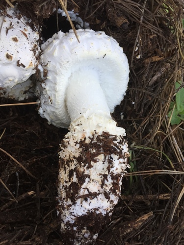 Der Stiel ist weiß. Besondere Merkmale: Ring, knollige Basis, faserig, flocken.