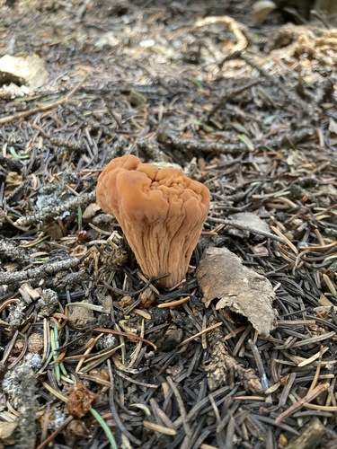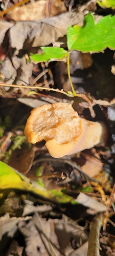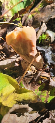 Der 1–3 cm breite Hut ist braun-orange-gelb-rosa gefärbt.
