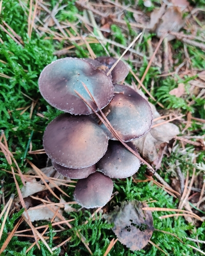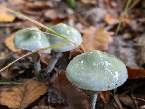 Der 3–11 cm breite Hut ist blau-grün gefärbt. Die Form ist meist schirmförmig, andere, kegelförmig. Er ist hygrophan (Die Hutfarbe ändert sich bei Feuchtigkeit).