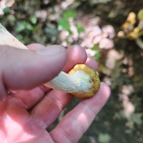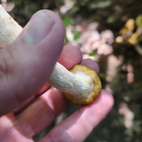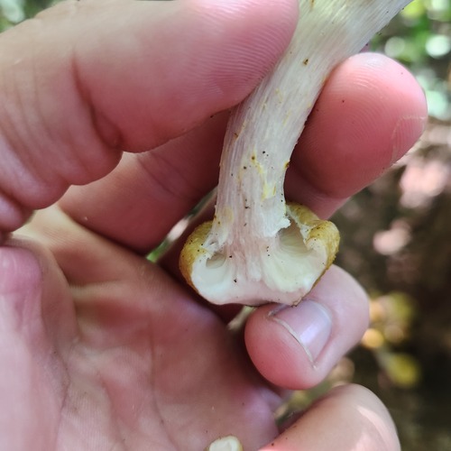 Der Stiel ist orange-braun-grau-weiß-gelb. Besondere Merkmale: Ring, faserig, brüchig, flocken, genattert.
