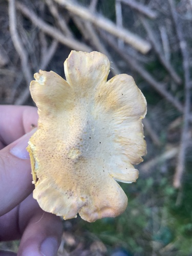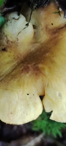 Die Unterseite zeigt Farben von gelb/orange. Sie sind angewachsen, herablaufend.