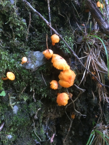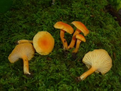 Der 1–9 cm breite Hut ist orange-gelb-rot gefärbt. Die Form ist meist trichterförmig.
