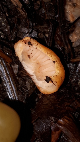 Die Unterseite zeigt Farben von gelb/orange/weiß. Sie sind angewachsen, herablaufend.