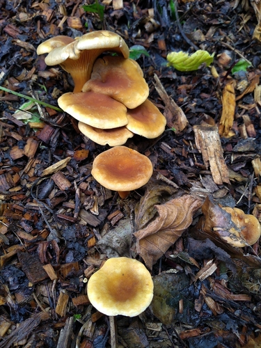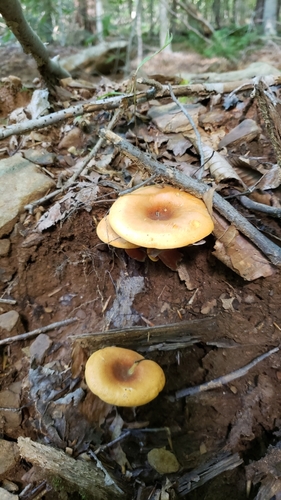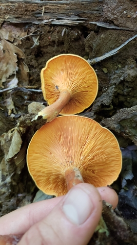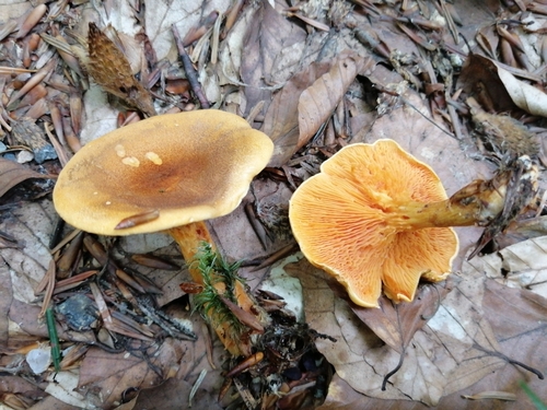 Die Unterseite zeigt Farben von orange/gelb/braun. Sie sind angewachsen, herablaufend.