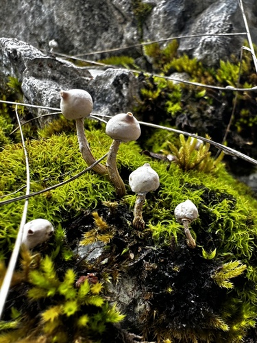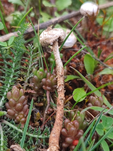 Der 1–2 cm breite Hut ist weiß-grau-gelb-braun gefärbt. Die Form ist meist kegelförmig, andere.