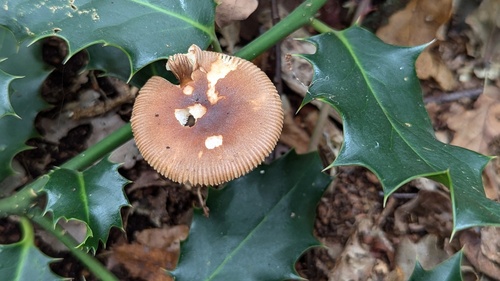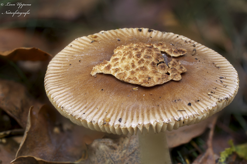 Der 2–9 cm breite Hut ist braun-rot-orange-gelb gefärbt. Die Form ist meist schirmförmig, andere, geriefter Hut.