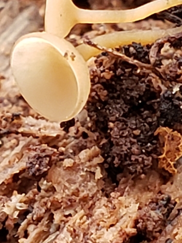 Der 1–1 cm breite Hut ist orange-gelb gefärbt. Die Form ist meist trichterförmig.