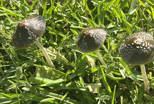 Der 1–9 cm breite Hut ist braun-weiß-schwarz gefärbt. Die Form ist meist kegelförmig, andere, schirmförmig, geriefter Hut.