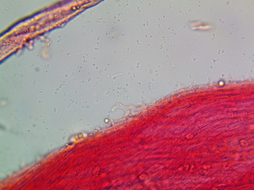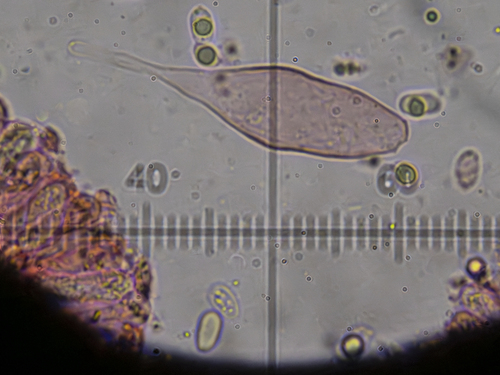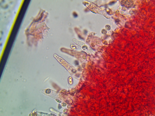 Der Stiel ist rosa-braun-weiß. Besondere Merkmale: faserig, hohl, Wurzelbasis.