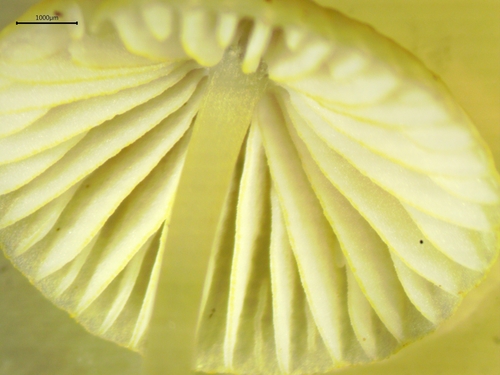 Die Unterseite zeigt Farben von gelb/weiß. Sie sind angewachsen.