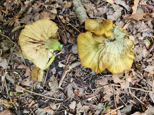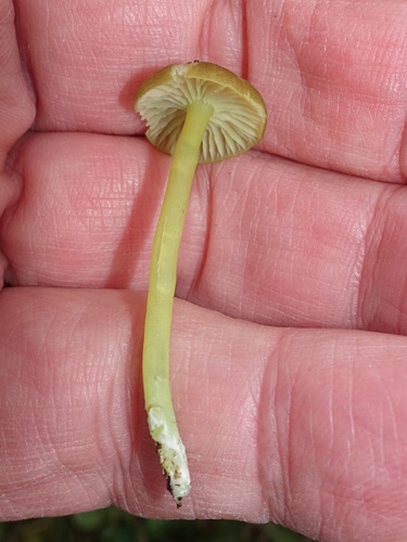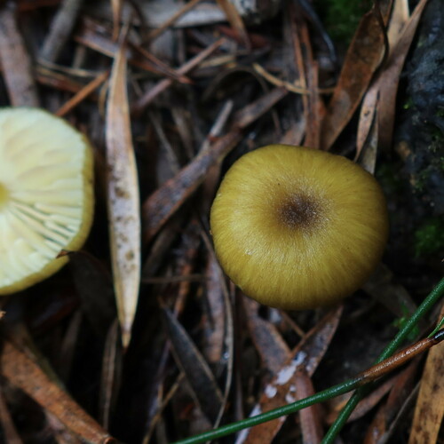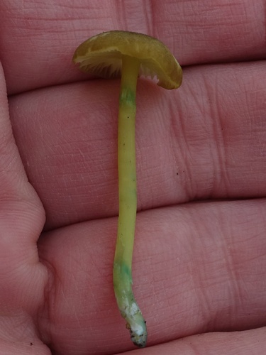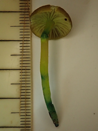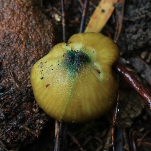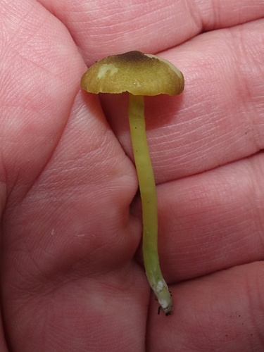 Der 1–6 cm breite Hut ist braun-grün gefärbt. Die Form ist meist trichterförmig, andere, geriefter Hut. Er ist hygrophan (Die Hutfarbe ändert sich bei Feuchtigkeit).