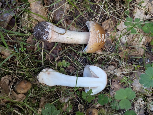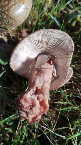 Der Stiel ist rot-orange-braun-grau-rosa-weiß-gelb. Besondere Merkmale: faserig, brüchig, flocken, Ring, knollige Basis, hohl, Wurzelbasis, genattert.