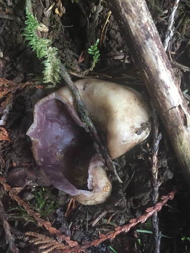Der 2–18 cm breite Hut ist rosa-blau-weiß gefärbt. Die Form ist meist trichterförmig.