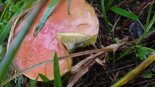 Die Unterseite zeigt Farben von gelb/grün. Sie sind angewachsen, herablaufend.