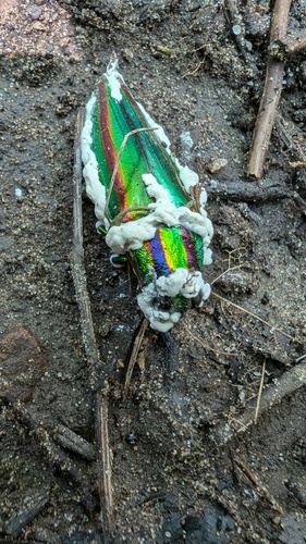 Der Ungestielter Insektenschimmelpilz (Beauveria bassiana) ist ein Pilz mit dem Speisewert ungenießbar. Die Hauptsaison erstreckt sich von März bis Dezember. Er wächst bevorzugt auf Boden, Wiese.