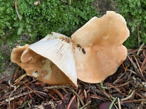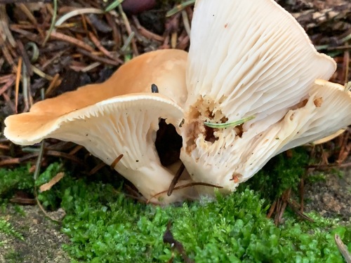 Die Unterseite zeigt Farben von weiß/orange/braun/gelb. Sie sind angewachsen, herablaufend.