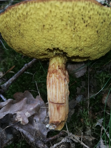 Der Stiel ist orange-gelb-weiß-braun. Besondere Merkmale: faserig, brüchig, Netz, genattert, knollige Basis.