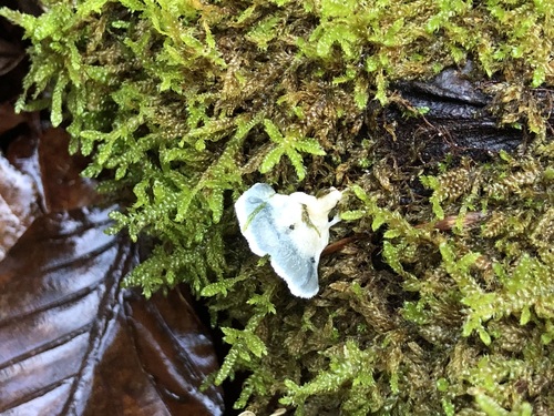 Der 2–12 cm breite Hut ist blau-grau-weiß gefärbt. Die Form ist meist schirmförmig.