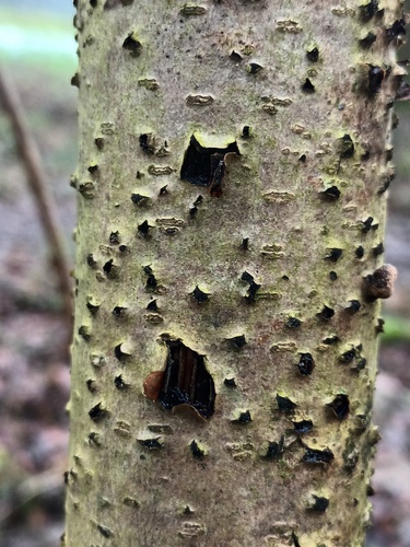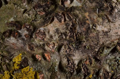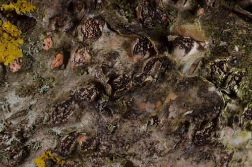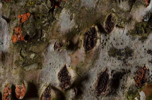Der Rindensprengendes Eckscheibchen (Diatrypella favacea) ist ein Pilz mit dem Speisewert ungenießbar. Die Hauptsaison erstreckt sich von November bis Mai. Er wächst bevorzugt auf Holz.